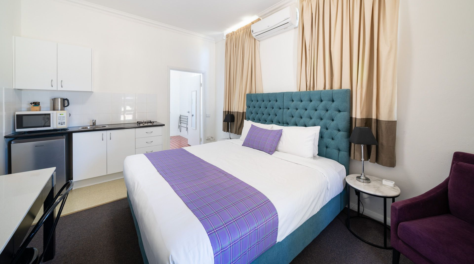 Step into your spacious, air-conditioned suite and unwind in the comfort of an extra-large double bed, stylish bathroom, and flat-screen TV with streaming at your fingertips. With a fully equipped kitchen, cozy dining area, and private barbecue, it’s the perfect retreat for relaxing nights and leisurely mornings.